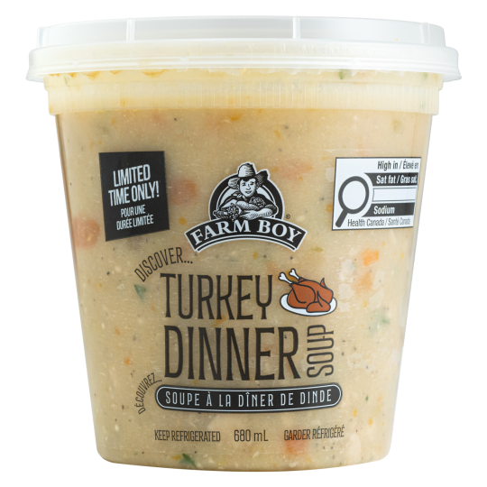 Soup Base (Water, Potatoes, Onions, Carrots, Celery, Canola Oil, Garlic, Salt, Sugar, Onion Powder, Garlic Powder, Parsley, Black Pepper, Olive Oil) • Turkey Gravy (Turkey Stock, Butter, Enriched Wheat Flour, Soy Sauce, Poultry Seasoning, Black Pepper) • Turkey. Contains: Milk • Soy • Wheat. May Contain: Peanuts • Tree Nuts • Sesame • Eggs • Seafood/Fish • Sulphites • Mustard. Storage: Keep Refrigerated